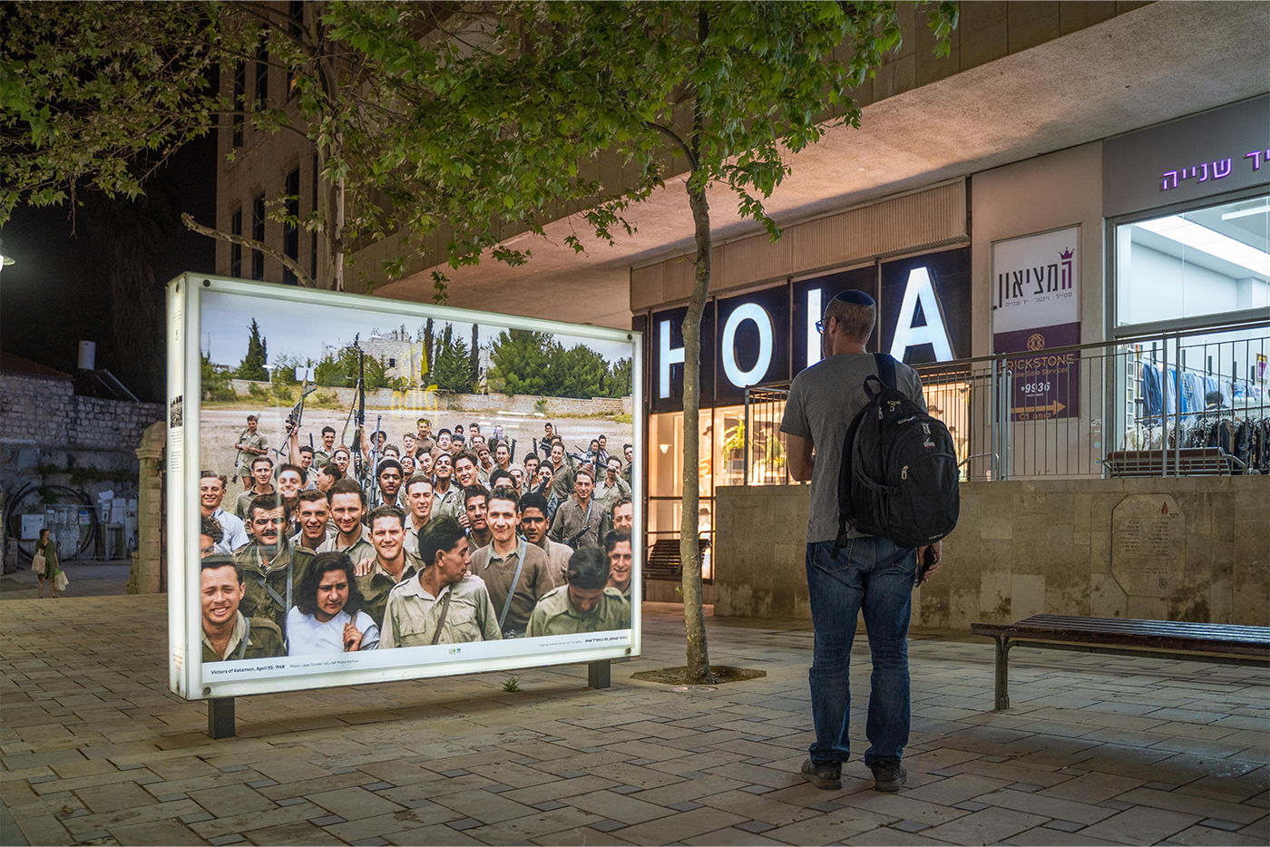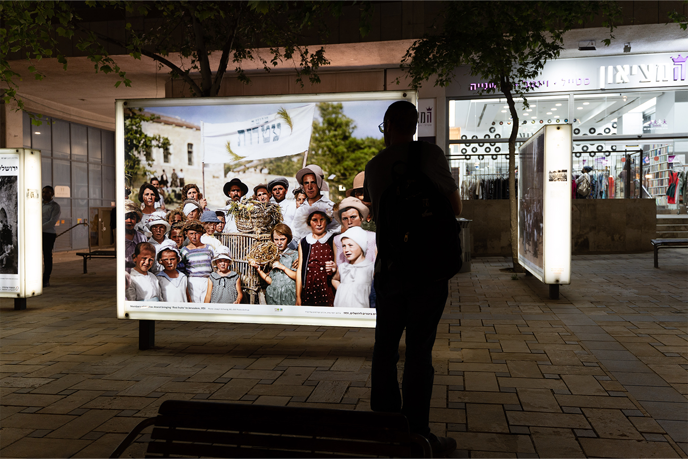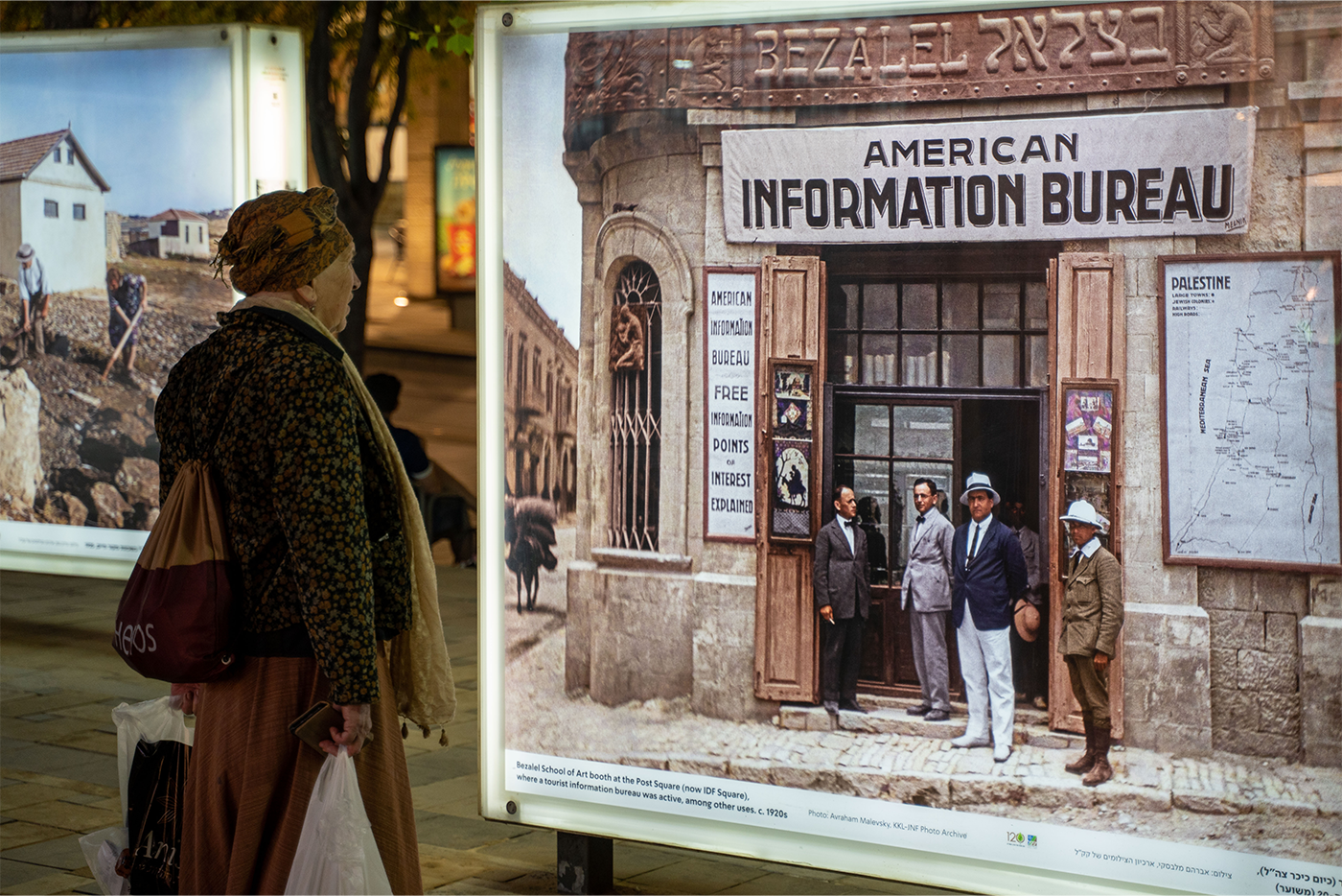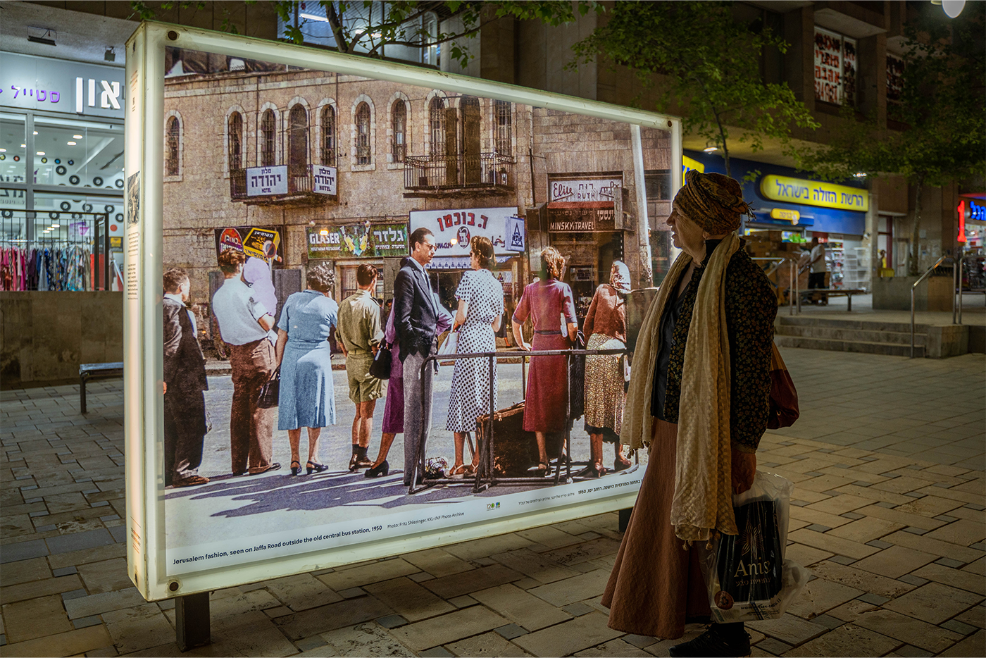In the current exhibition, Keren Kayemeth LeIsrael – Jewish National Fund restores the lost colors to historical photographs of Jerusalem, resuscitating the tones of light and shadow that were erased by Time. Through innovative colorization technology combined with historical research on culture and fashions of earlier times, we breathed new life into the hard-working stone dressers, the elegant people waiting for their bus on Jaffa Road, and the joyous figures of the IDF fighters after the bitter battle for Katamon during the War of Independence.